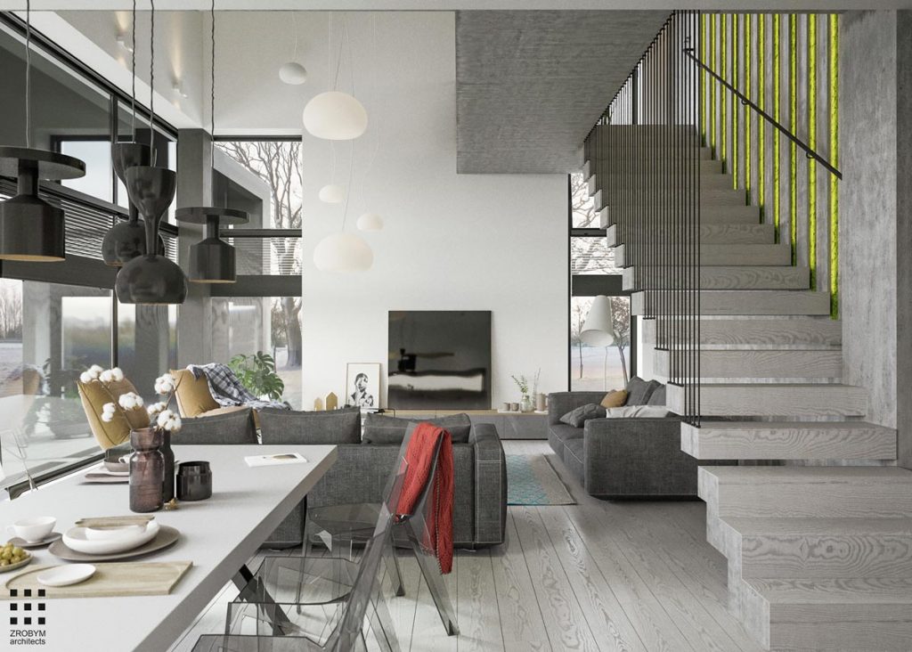 Not every home has a unifying color theme, but without one it can be easy for a house to feel disjointed or erratic. A color palette can unify a home’s design so that it flows easily from one room to another, but that does not mean that each room has to be decorated in exactly the same colors. In this house, for instance, grey creates a throughline within the home but does not overwhelm the design. Instead, it creates a foundation for each room so that the overall look is comforting and harmonious — without being too “matchy-matchy.” Take a look inside this home from visualizer Andrei Lychkouski to see what we mean.